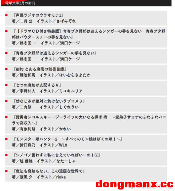电击文库明年2月新刊列表:创约魔法禁书目录,七魔剑,猪头少年,青梅竹马等等